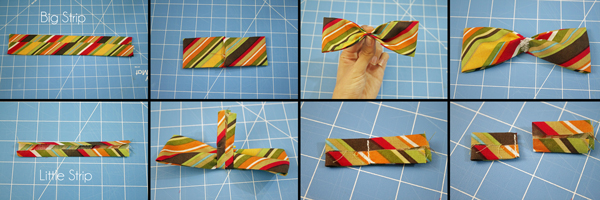 1. Fold the sides of your big strip in to the middle and press. 2. Fold the ends of the big strip in to the middle and press. 3. Pinch the middle of your bow into the classic bow tie shape. 4. Sew the middle down securely, either by hand or with a machine. 5. Fold the sides of your little strip into the middle and press. 6. Wrap your little strip around the middle of the bow tie inside out and pin at the back. 7. Slide the loop off of the bow and stitch on the outside of the pin. 8. Trim the excess fabric off.